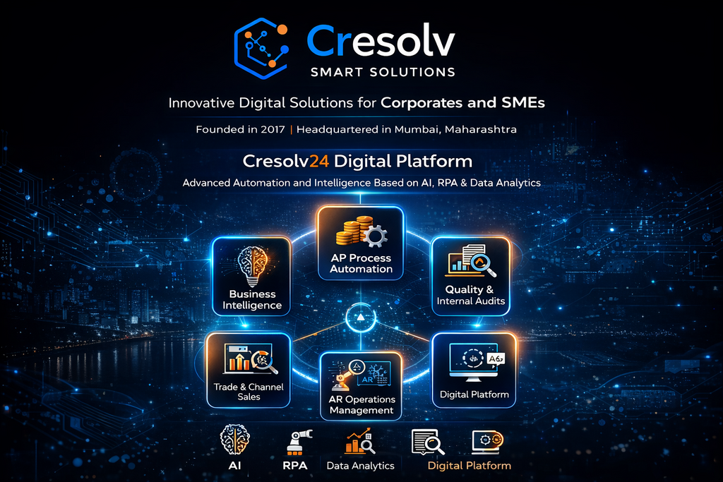 Cresolv Smart Solutions, founded in 2017 and headquartered in Mumbai, Maharashtra, delivers innovative digital products focused on process automation, audits, sales management, and business intelligence for corporates and SMEs. Cresolv digital offerings address operational challenges through technology like AI, RPA, and data analytics, including SalesIQ for trade management and incentive automation, continuous audit tools, and supply chain solutions